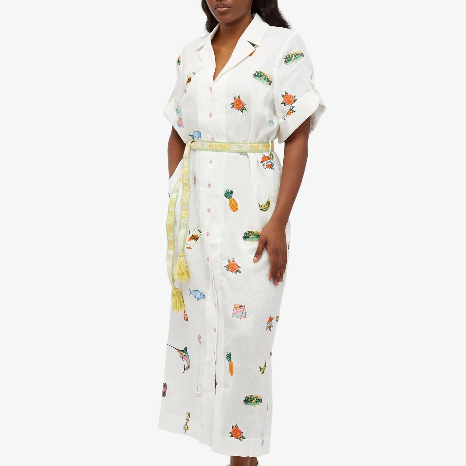Escape to warmer weather and dreamy sceneries with the Blue Marlin Embroidered Dress by ALÉMAIS. Crafted with a breezy linen material that’s sprinkled with vibrant motifs of paradise from artist Alan Berry Rhys, this dress screams summer relaxation. Featuring a relaxed open collar design, you can tweak the sleeves and belt to your liking.